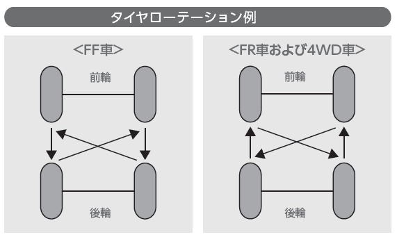 ※前後輪でタイヤサイズが異なる場合は、前後輪でのローテーションはできません。