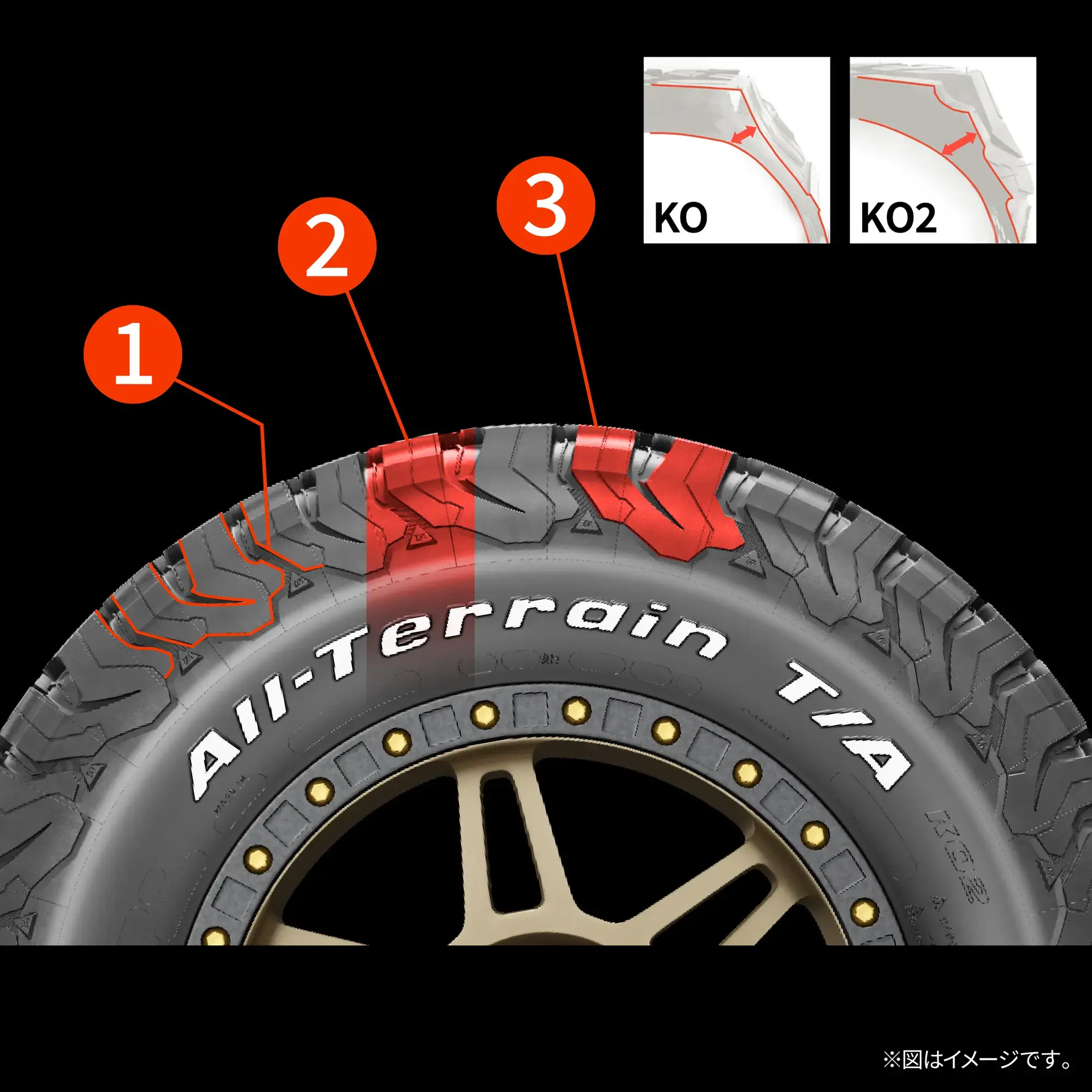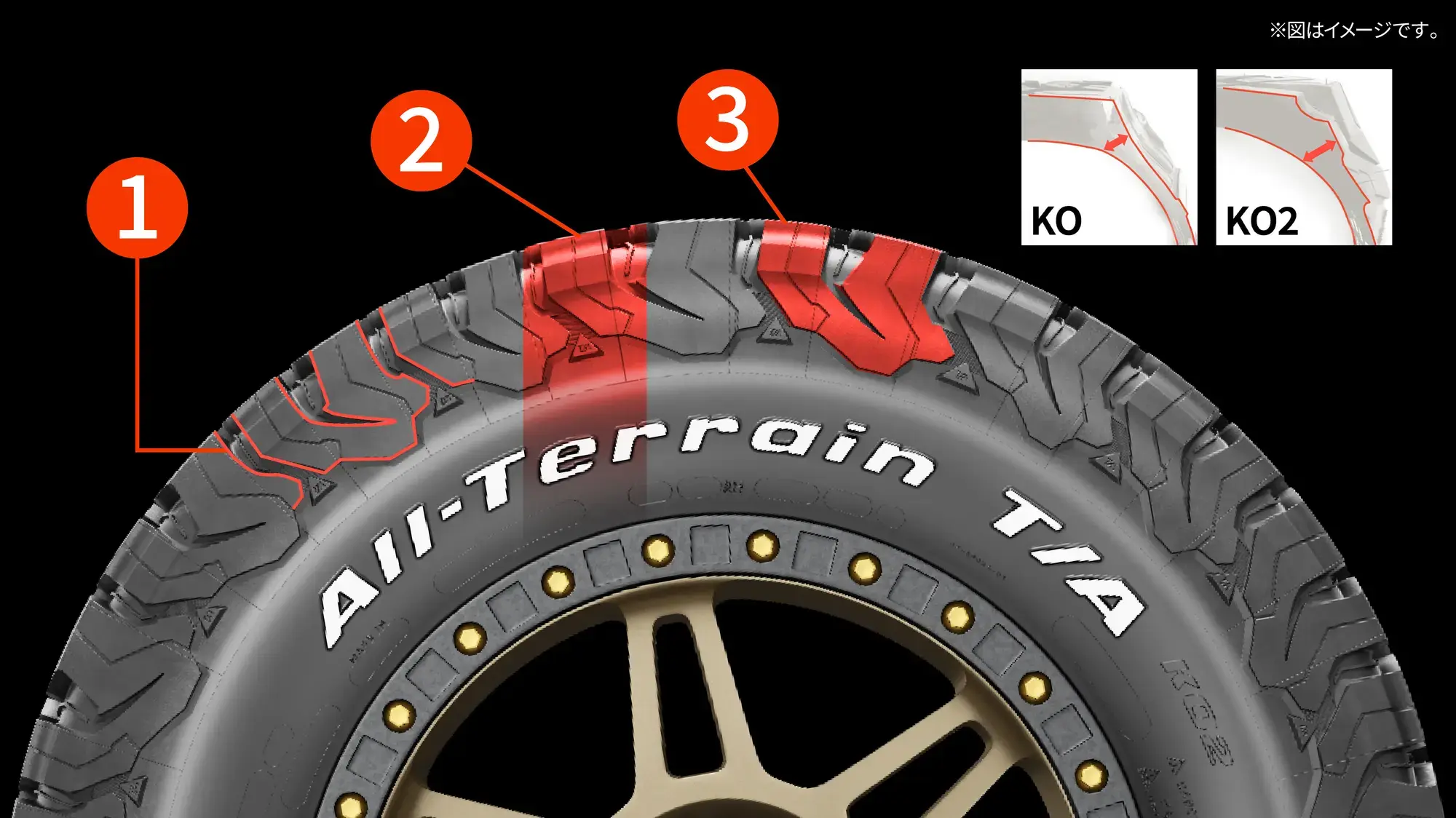 加えて、悪路走破時の外傷ダメージに配慮し、ショルダーゾーンのゴム幅を従来モデル(KO)より厚く設計しています③。