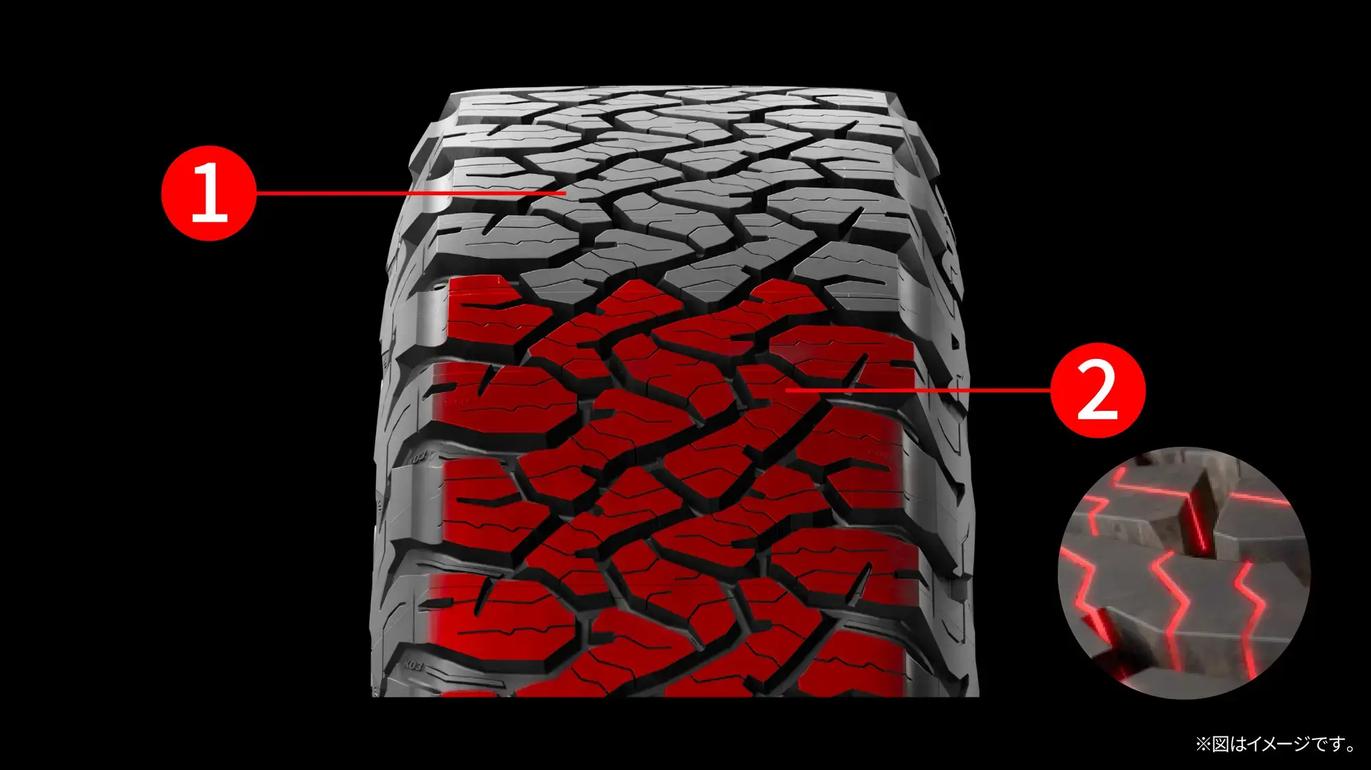 さらに、オンロードでも過酷なオフロードでも耐久性を発揮するニュー・オールテレーン・コンパウンド①を採用。