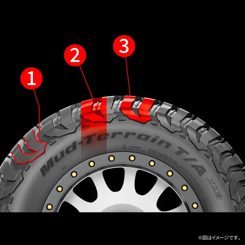 Baja1000で強さを誇るBaja T/A KR2で培われたテクノロジーを、Mud-Terrain T/A KM3のサイドウォールに応用しています。 まず、BFGoodrich 4x4/SUV用タイヤに共通するショルダー部のV字型ブロックデザイン「アドバンスド・デフレクション・デザイン」①が、オフロードカスタムらしいイメージを演出しつつ、経年使用時の裂けや割れを抑制します。 さらに、本場アメリカのレースからフィードバックされたタフサイドウォールラバー②を採用し、外傷に強い構造を実現。 加えて、ショルダーゾーンのゴム幅を厚く設計③することで、悪路走行時の外的ダメージへの耐性を高めています。
